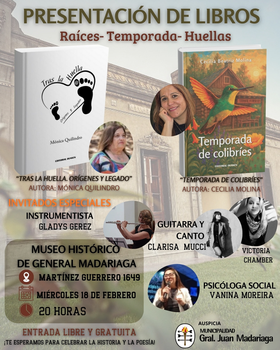 Madariaga vibra entre huellas y colibríesTras la gran repercusión de su primera presentación, los libros Tras la Huella de Mónica Quilindro y Temporada de Colibríes de Cecilia Molina regresan al Museo Histórico del Tuyú en el marco de las Tardecitas de Verano, para ofrecer una noche de literatura, música y encuentro comunitario.